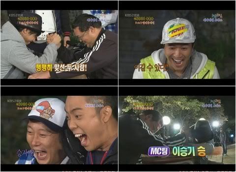 但是真的开始对决的时候,李昇基却和李秀根的经纪人是不相上下的对峙状态,把现场的人员都吓了一跳。比看起来手劲更大的李昇基发挥了不知道哪来的怪力,最终赢了李秀根的经纪人。预想之外的胜利,让现场的工作人员和成员们兴奋了。