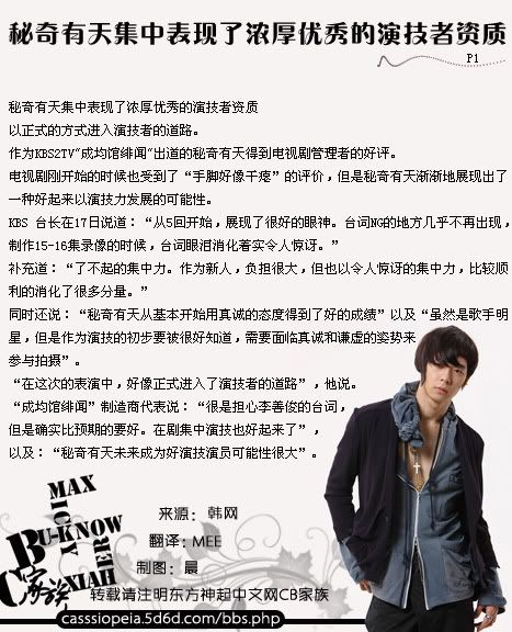 秘奇有天所属的事务所也说:“秘奇有天在拍摄’成均馆绯闻’前,接受了残酷的演技课程。通过不断地练习,展现了现在的演技”。