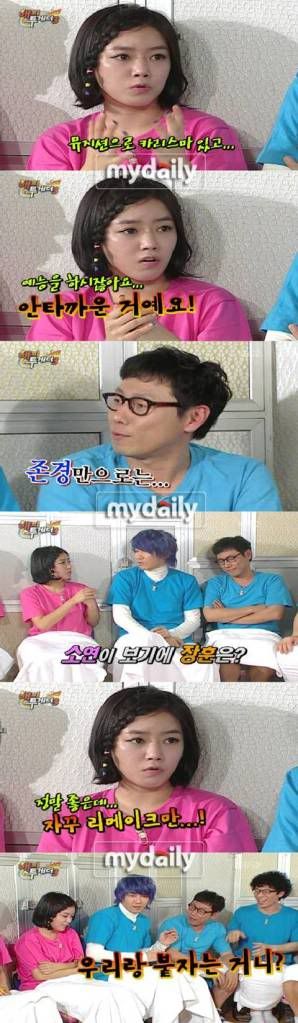 27日晚上放送的KBS2TV“happy together”里出演的素妍和尹忠信对话说“平时作为音乐人很有风范,认为是个了不起的歌手”“但是最近看了很多尹忠信的艺能节目感觉有些难过”让尹忠信感到很惊慌.