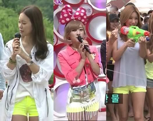 Kara成员Nicole,歌手白智英以及After School正雅穿着同款同色热裤,她们分别在SBS《人气歌谣》,KBS《青春不败》和《娱乐周刊》上穿着同样的短裤。
