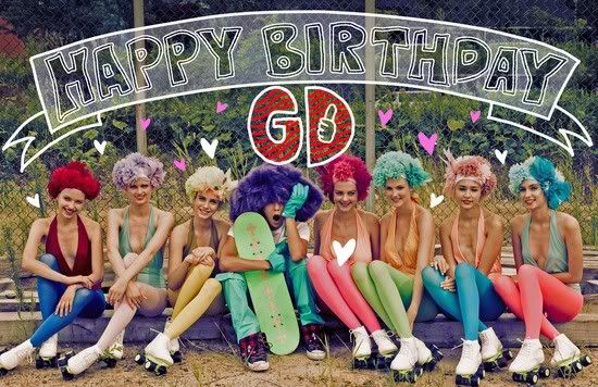18日零时,YG官方博客上传了题为"HAPPY BIRTHDAY GD"的照片。公开的照片上,G-Dragon戴着充满个性的紫色帽子,坐在花花绿绿的美国女孩中间,张大嘴巴,演绎惊讶的表情。尤其,这些美国女孩们穿着颜色鲜明、绚丽多彩的丝袜以及大胆性感露胸的上衣,吸引了不少众人的视线。