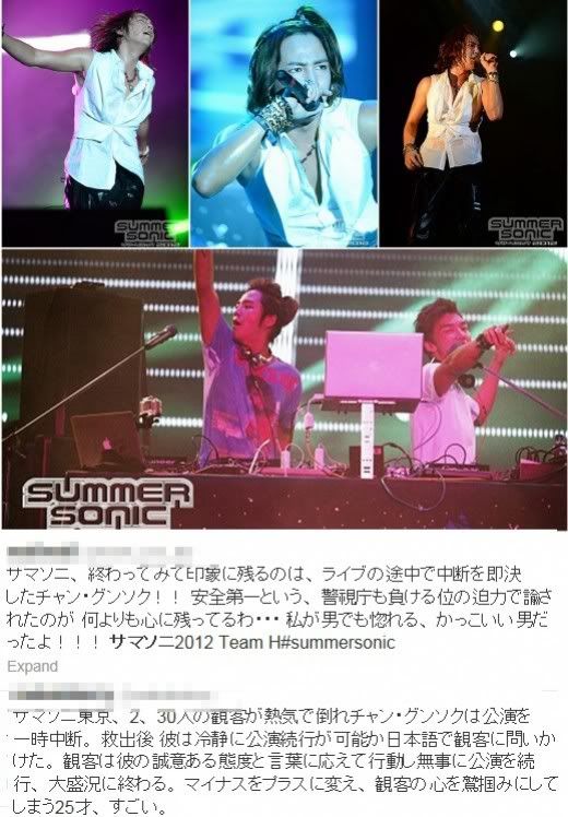 据日本粉丝透露,当时张根硕非常沉着冷静对待突发事件,令看到的人也惊讶不已。站席上的20-30名粉丝因着狂热的场内氛围,被挤到外面,之后张根硕用日语宣告了重返舞台。