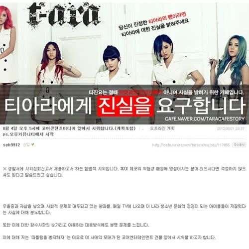 T-ara成员花英退出后,粉丝们建立的'T真要(要求T-ara解明真相)的'网络论坛中,会员们日剧跃增,逐渐开始网外的活动。
