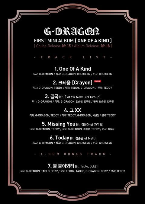 YG娱乐3日上午公开BigBang G-Dragon新个人专辑的曲目列表。